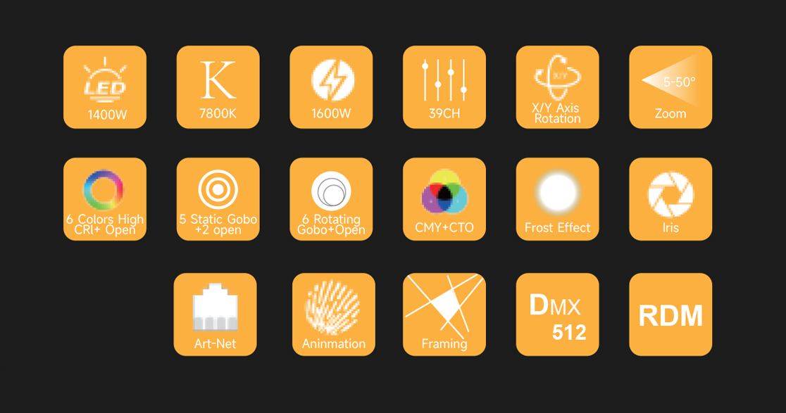OUTPUT Light Sources: Powerful 1400W LED module LED life expectancy: 20,000 hours Diameter of frontal lens: 178 mm Color temperature: 7800K Zoom Angle: 5–50°DYNAMIC EFFECTS Color Wheel 1: 6 colors + High CRI Filter + open Color Wheel 2: Independent CMY & CTO System Static Gobos: 5 + 2 open Rotating Gobos: 6 + open Gobo Shake: Yes Prism: 4 Facet Prism, rotatable Framing System: 4 Blades, each with separate movement and full blackout, ±90° of the complete framing system, 180° rotation angle Iris System: linear 5% to 100% spot zoom Animation Wheel: Independent animation wheel linear insertion, it can achieve infinite rotation effect Frost: YES Focus: YES Dimmer: YES Strobe: YES Pan/Tilt Range: 540° Pan 270° TiltCONTROL Control Protocols: DMX512, RDM DMX Channel: 39ELECTRONIC Voltage Range: 100–240V, 50/60Hz Power consumption: 1600WPHYSICAL Dimensions: 461326878 mm Weight: 46KG (101.41 lbs) LISTINGS Certification: CE & RoHS Environment: IP20