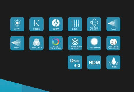 - Rotating Gobos: 8 + open
