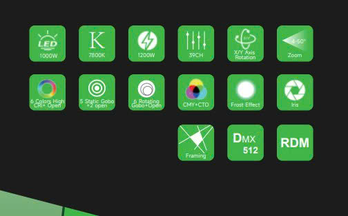 - Light Sources: Powerful 1000W LED module